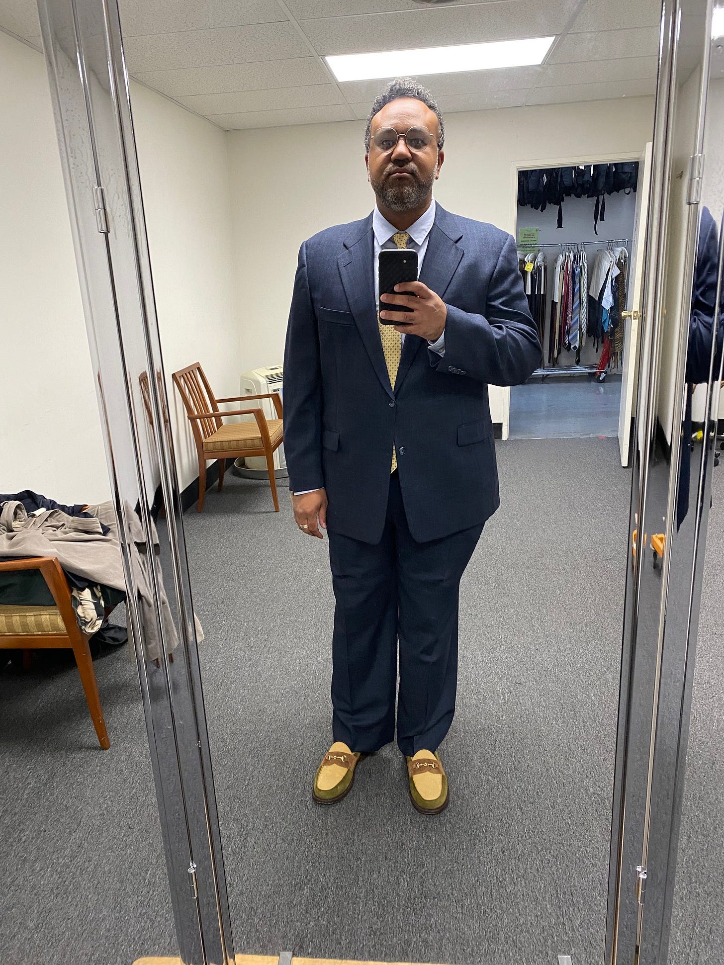 So, I drove up to Burbank to a costume warehouse and met with the designers working on the reshoots. I was asked to bring my own clothes, something that a soccer executive would wear. I brought my double-breasted Stoffa suit and a double-breasted vintage navy blue Christian Dior Monsieur blazer. The Stoffa was immediately discarded for being too modern and cool looking. My shoes, a pair of Blackstock & Weber loafers, were an immediate hit with the team and made it into the film. The Dior piece was a maybe, but we were at a costume warehouse, so why not try some things on?